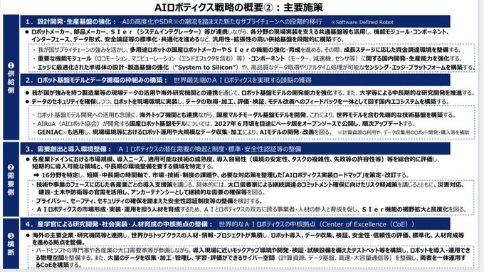 従来の「技術開発→その後に導入」から転換し、供給側と需要側を一体設計。導入→データ獲得→モデル改善→横展開の好循環を回す。 これがこれまでのロボット戦略との決定的な違いです。