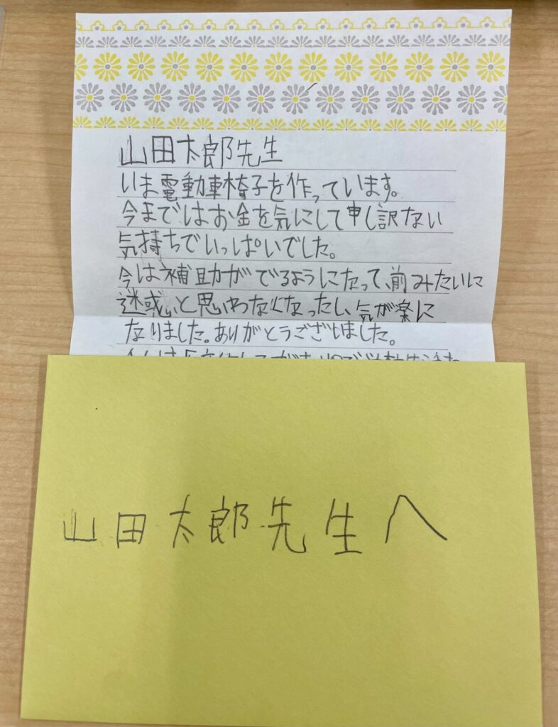 これは、以前、補装具の所得制限に引っかかり支援を受けられなかったこどもからのお手紙です。その素直な言葉に、胸が熱くなりました。そして、「やってよかった」と心から思いました。