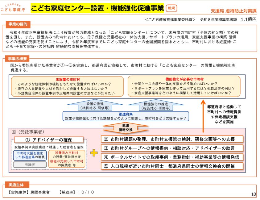 • こども家庭センターの機能強化:現在の設置数(約7割)に満足せず、「手段が目的にならないよう」設置後の機能をしっかり果たしていくため、国として職員配置などを意識し、自治体を支えることを強調 。