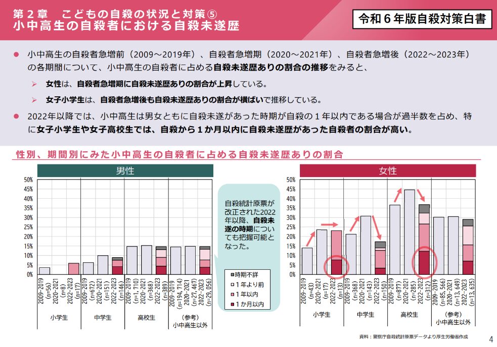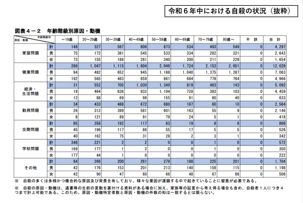 • 統計の分析:10代20代は健康問題が一番多いが、女子中高生に特にうつ病やパニック障害などの精神疾患が多いことが判明。これらの精神疾患が学校問題と複合している可能性が高いと分析 。
