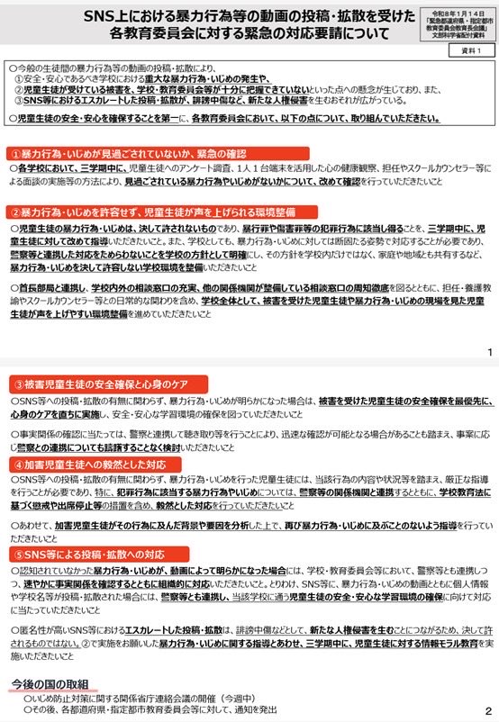 日本では、自力救済や私刑は認められていません。SNSでのいじめ動画の拡散は、名誉毀損罪・侮辱罪等といった刑罰の対象となりうる行為であり、加害者だけでなく被害者をも傷つける行為です。そのため、SNSにいじめ動画が投稿されないようにするための啓発、拡散されて権利侵害が起きた際の削除要請等の手段の周知については、否定しません。しかし、SNSにいじめ動画が投稿されてしまった場合には、単に当該動画の削除を促す前に、まずは行政として動画を保存すること(著作権法42条で可能なはずです)、必要に応じて、国の担当者が、法の要請に従い検察官・警察官に告発をすること(刑事訴訟法239条2項)等が行われるべきです。 間違っても、行政の削除要請等によって動画が削除された後に、「行政としては動画が削除されて内容が確認できないので対応ができない」といった発言がなされないようにすることが重要です。