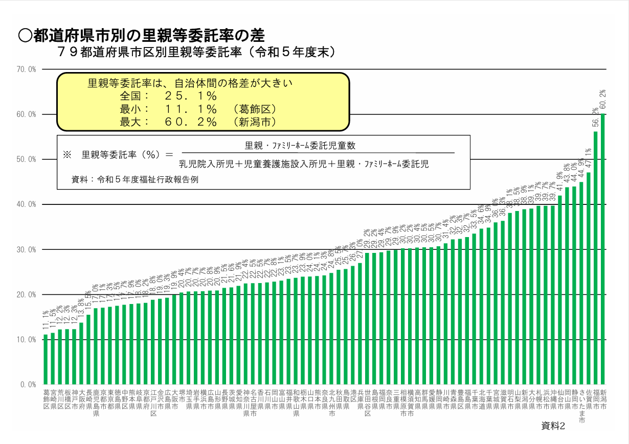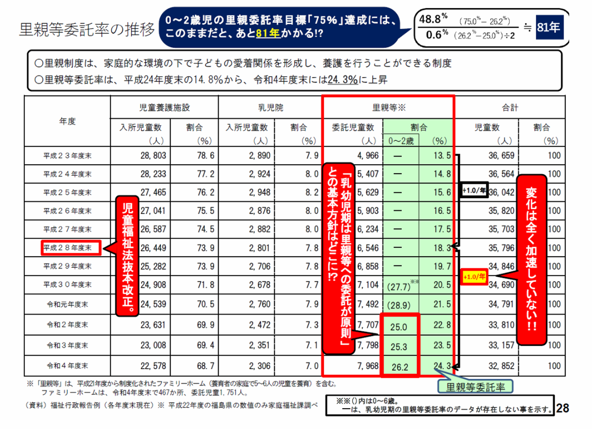 3歳未満の里親委託率29.4%。5倍以上に広がる自治体格差。75%達成までなお41年。生まれた地域で左右される、こどもの権利。変わらない乳児院中心の集団養育。国際的にも大きな後れ。