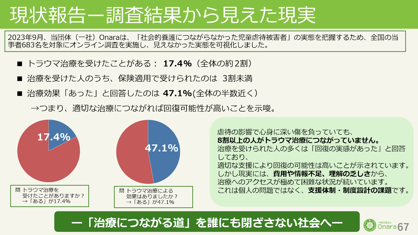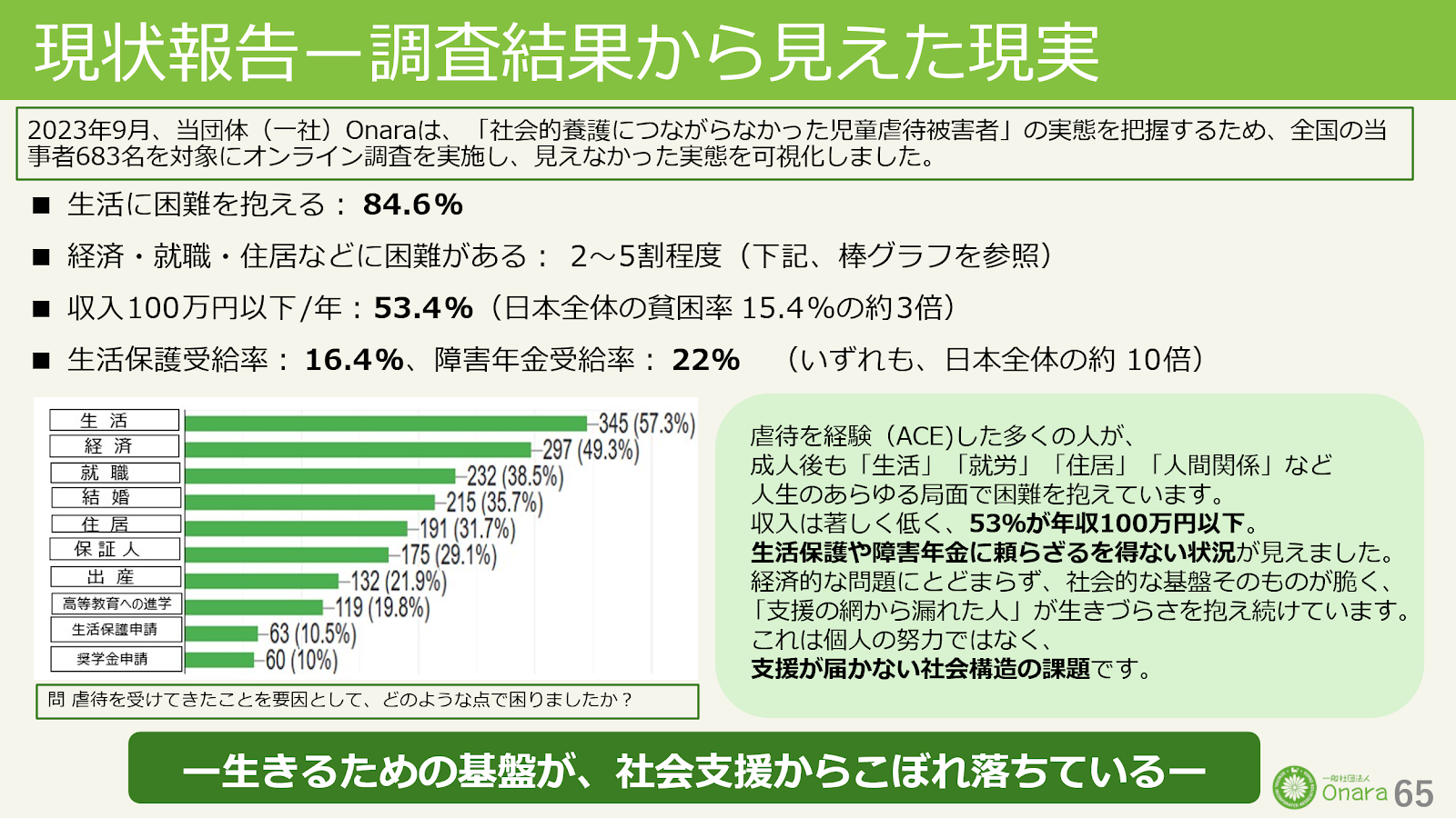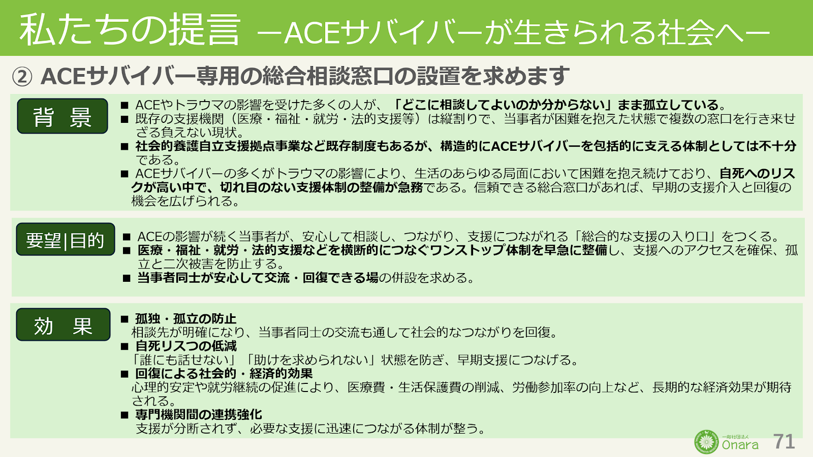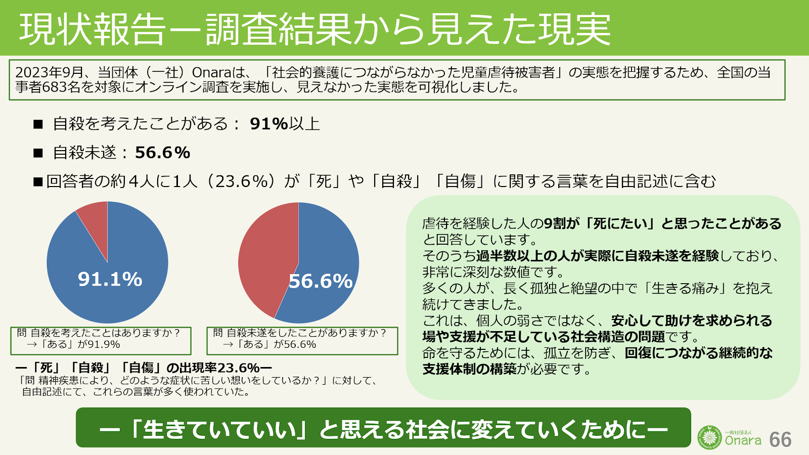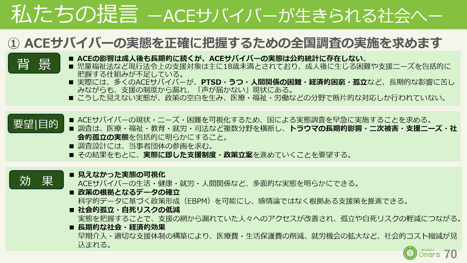 集会ではその後、丘咲代表ご本人を含む4名のACEサバイバーの方々から、それぞれの逆境的小児期体験、そして今後の公的ACEサバイバー支援に求める政策提言をお話しいただきました。加えて丘咲代表からは、Onaraで実施したアンケート調査に基づくACEs体験者の総数などについて、ご活動の現状報告をいただきました。社会的養護に繋がらなかった児童虐待被害者の「91%が自殺を考えたことがある」、「56.6%が自殺未遂をしたことがある」という衝撃的な数字も明らかになりました。