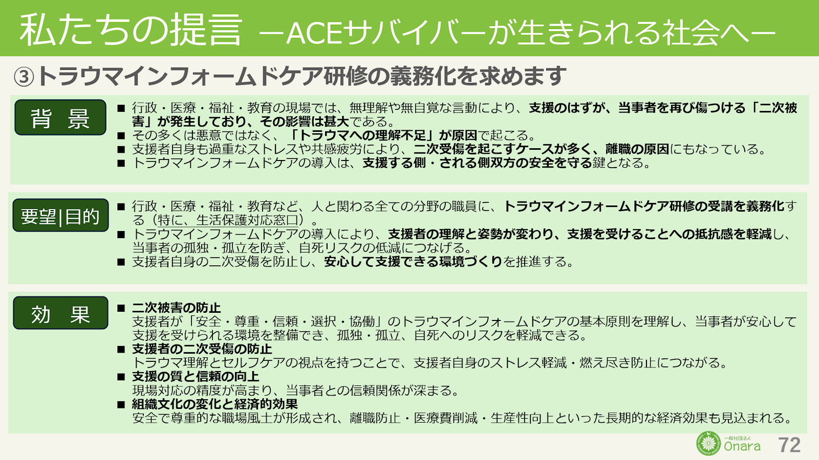 政策提言では、トラウマケア人材の育成やカウンセリングの保険適用など、幅広いご意見をいただきました。